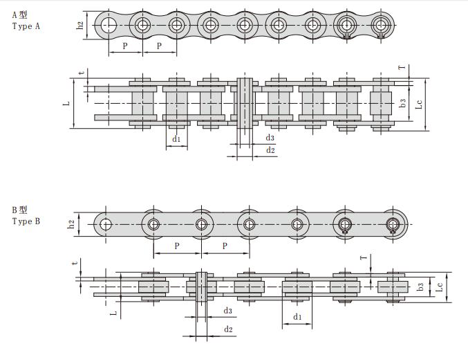 鏈號 節(jié)距 滾子直徑 外節(jié)內寬 銷軸直徑 銷軸長度 內鏈板高度 鏈板厚度 破斷載荷 每米長重 型號