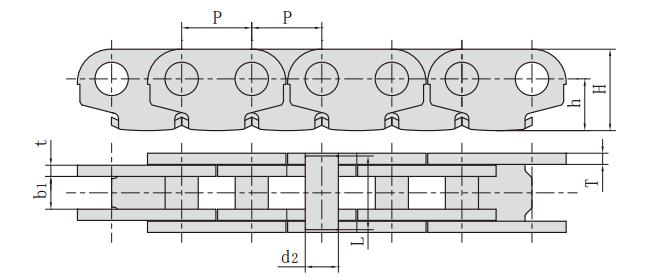 鏈號 節(jié)距 內(nèi)節(jié)內(nèi)寬 銷軸直徑 銷軸長度 鏈板尺寸 抗拉強(qiáng)度 每米長重