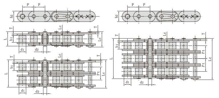 鏈號 節距 滾子直徑 內節內寬 銷軸直徑 銷軸長度 內鏈板高度 鏈板厚度 破斷載荷 每米長重