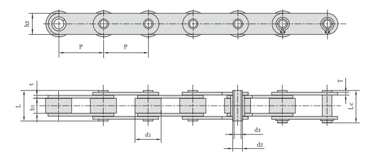 餅干輸送線,糕點(diǎn)輸送線,食品機(jī)械輸送線,主要選用不銹鋼雙節(jié)距空心銷軸鏈為主,圖中選用型號(hào)為C2042HPSS,中間連接桿總長(zhǎng)度為640mm,連接桿直徑8mm,鏈條主要規(guī)格參數(shù)見(jiàn)下圖: