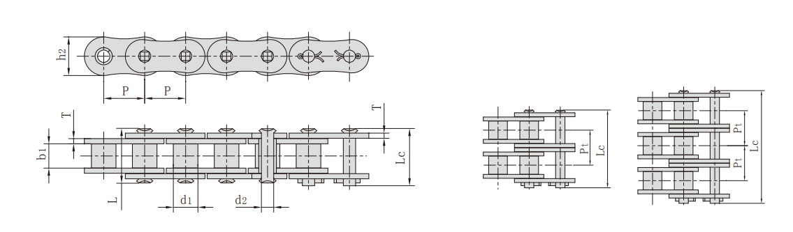 鏈條型號 節距 滾子直徑 內節內寬 銷軸直徑 銷軸長度 內鏈板高度 鏈板厚度 抗拉強度 每米長重