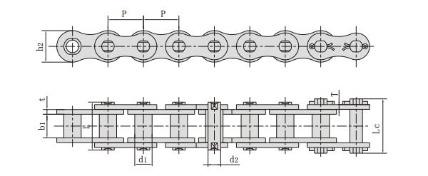 套筒鏈主要型號(hào)有:節(jié)距,套筒直徑,內(nèi)節(jié)內(nèi)寬,銷軸直徑,銷軸長(zhǎng)度,鏈板高度,鏈板厚度,抗拉強(qiáng)度,每米長(zhǎng)重