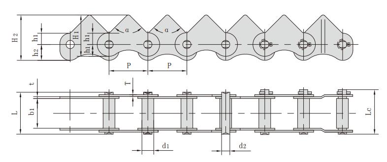 鏈號 節(jié)距 滾子直徑 內(nèi)節(jié)內(nèi)寬 銷軸直徑 銷軸長度 齒形角 鏈板厚度 鏈板尺寸 抗拉強(qiáng)度 平均抗拉強(qiáng)度