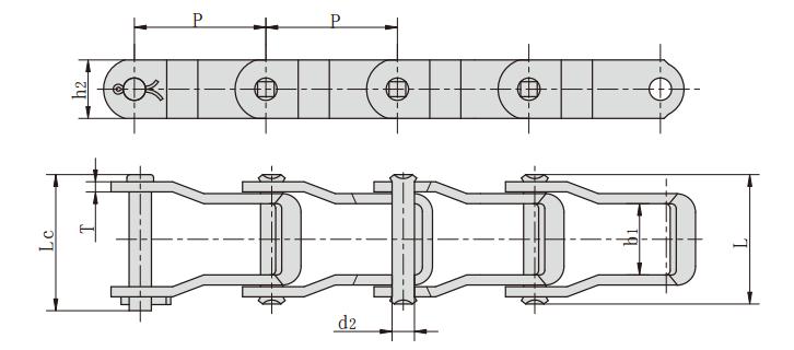 鏈號(hào) 節(jié)距 內(nèi)節(jié)內(nèi)寬 銷軸直徑 銷軸長度 鏈板高度 鏈板厚度 抗拉強(qiáng)度 每米長重