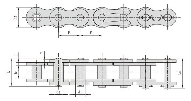 鏈號(hào) 節(jié)距 套筒直徑 內(nèi)節(jié)內(nèi)寬 銷軸直徑 銷軸長度 內(nèi)鏈板高度 鏈板厚度 抗拉強(qiáng)度 平均抗拉強(qiáng)度 每米長重