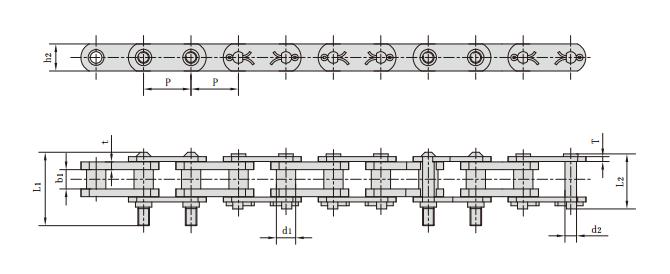 鏈號 節(jié)距 套筒直徑 內節(jié)內寬 銷軸直徑 銷軸長度 鏈板高度 鏈板厚度 抗拉強度 平均抗拉強度 每米長重