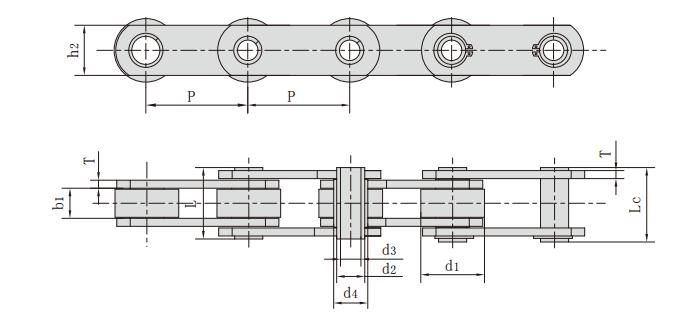 鏈號(hào) 節(jié)距 滾子尺寸 套筒直徑 鏈板高度 內(nèi)節(jié)內(nèi)寬 銷(xiāo)軸直徑 銷(xiāo)軸長(zhǎng)度 鏈板厚度 抗拉強(qiáng)度