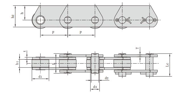 鏈號 節距 滾子直徑 銷軸直徑 套筒直徑 內節內寬 銷軸長度 鏈板高度 鏈板厚度 抗拉強度
