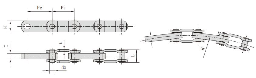 鏈條型號 節(jié)距 節(jié)距 內鏈板厚度 銷軸直徑 銷軸長度 鏈板尺寸 側彎半徑 抗拉強度 每米長重