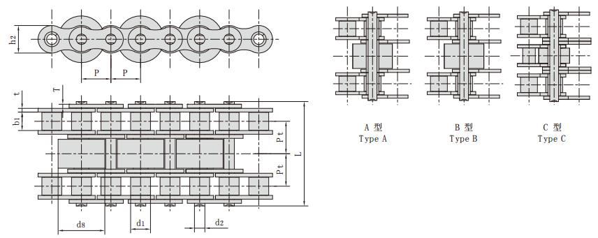 鏈號 節距 滾子直徑 內節內寬 銷軸直徑 銷軸長度 鏈板尺寸 排距 抗拉強度 平均抗拉強度 型號