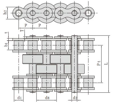 鏈號(hào) 節(jié)距 滾子直徑 內(nèi)節(jié)內(nèi)寬 銷(xiāo)軸直徑 銷(xiāo)軸長(zhǎng)度 鏈板尺寸 排距 抗拉強(qiáng)度 平均抗拉強(qiáng)度